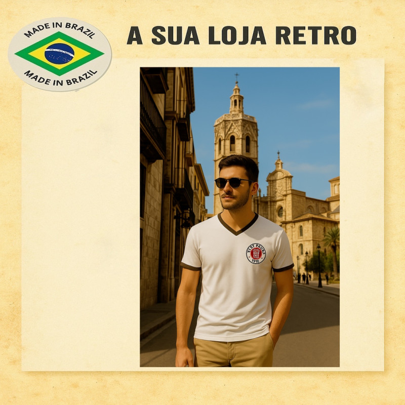 Camisa retrô do St. Pauli, inspirada na década de 70, usada no estádio Millerntor-Stadion. Manto sagrado do clube fundado em 15/05/1915.Tecido de alta qualidade, escudo bordado, gola V, manga curta, faixa no ombro e cor marrom. Padrão da Futebol Retrô. Confecção: 16 dias úteis. Entrega conforme Correios.